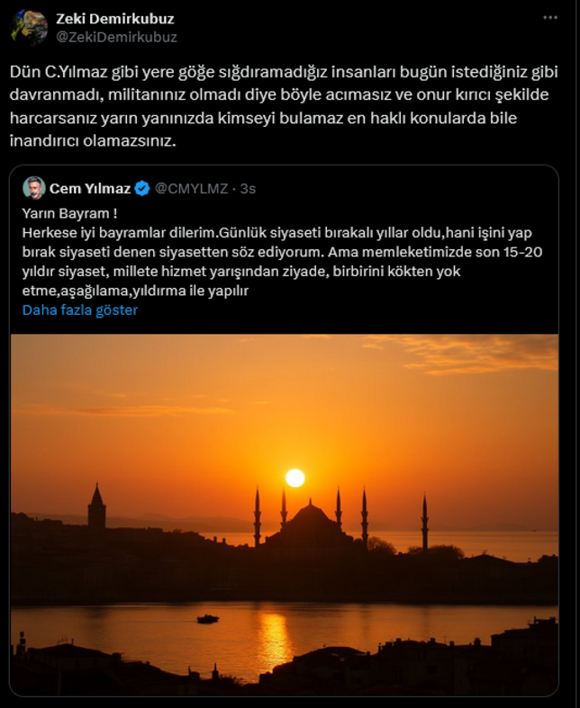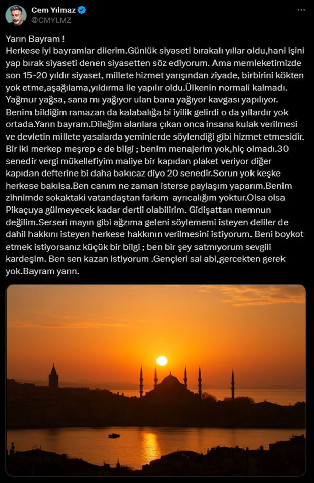 Cem Yılmaz, sosyal medya hesabından yaptığı paylaşımda, "Yarın bayram! Herkese iyi bayramlar dilerim. Günlük siyaseti bırakalı yıllar oldu, hani 'işini yap, bırak siyaseti' denen siyasetten söz ediyorum. Ama memleketimizde son 15-20 yıldır siyaset, millete hizmet yarışından ziyade, birbirini kökten yok etme, aşağılama, yıldırma ile yapılır oldu. Ülkenin normali kalmadı. Yağmur yağsa, 'sana mı yağıyor ulan bana yağıyor kavgası yapılıyor.