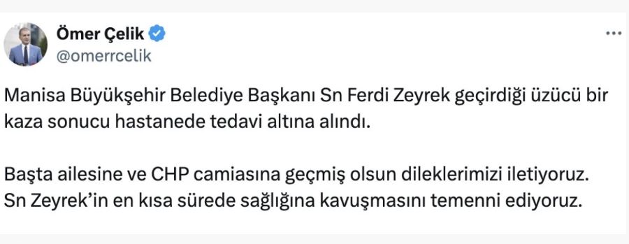 AK Parti Sözcüsü Ömer Çelik, yoğun bakımda tedavisi süren Ferdi Zeyrek'e ilişkin geçmiş olsun mesajı yayınladı.