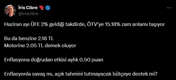 TÜİK'in 3 Temmuz günü açıklayacağı enflasyon verileri öncesinde sosyal medya hesabından açıklama yapan Cibre, Haziran ayı ÜFE'sinin yüzde 2 olarak açıklandığı takdirde, ÖTV'ye yüzde 15.18 zam geleceği anlamına geldiğini belirtti.