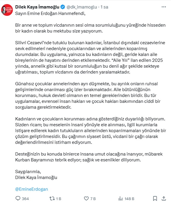 "Bu çağrımın siyaset üstü, vicdani bir çağrıdır" diyen Dilek İmamoğlu, X hesabından yaptığı paylaşımdaki mektubunda şu ifadeleri kullandı: