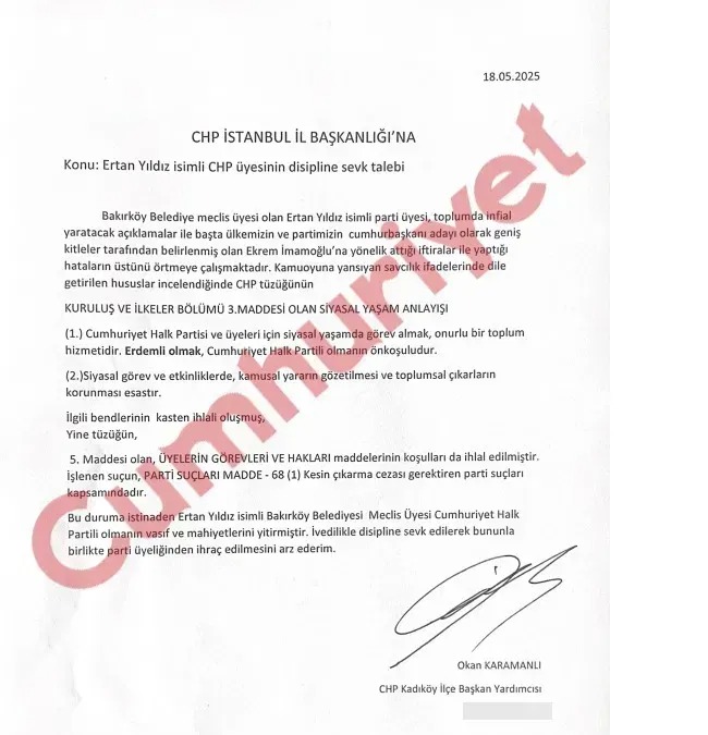 Bakırköy'den CHP İBB Meclis üyesi olan Yıldız’ın ilk aşamada disiplin kuruluna sevki, ardından partiden ihraç edilmesi talep edildi.