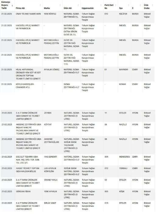 Bakanlığın açıkladığı listeye göre Bursa, İzmir, Aydın ve Mardin gibi birçok ilde faaliyet gösteren firmaların sahte zeytinyağı ürettikleri ortaya çıktı. Tüketicilere, zeytinyağı alırken etiket bilgilerine ve güvenilir markalara dikkat etmeleri tavsiye ediliyor.