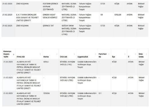 Son güncellenen listede özellikle zeytinyağında yapılan tağşişler ön plana çıktı. Yapılan laboratuvar testlerinde, bazı firmaların sattığı "Naturel Sızma Zeytinyağı" ürünlerine tohum yağları karıştırıldığı belirlendi.