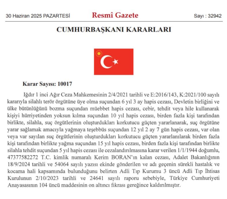 Buna göre Erdoğan'ın imzasıyla Anayasa'nın 104. maddesinin 16'ncı fıkrası uyarınca; 81 yaşındaki Kerim Boran'ın kalan cezası sürekli hastalık ve kocama; 54 yaşındaki Naci Kılıç'ın kalan cezası da sakatlık hali nedeniyle kaldırıldı.