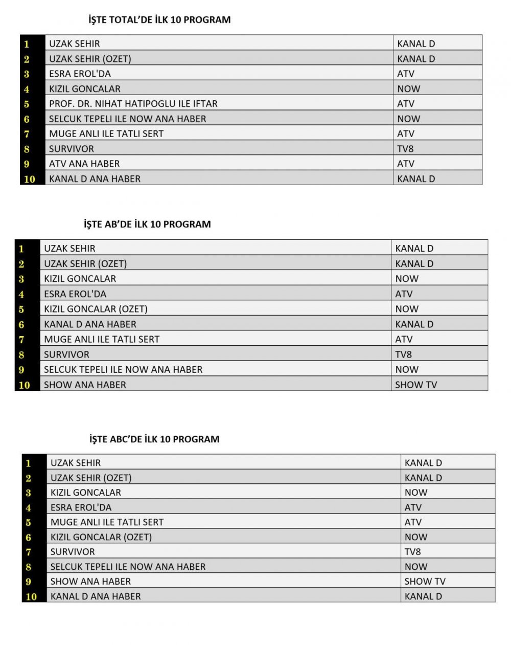 ABC grubunda da aynı tablo oluştu. "Uzak Şehir" birinci sırada yer alırken, özet bölümü ikinci sıraya oturdu. Now TV’nin popüler dizisi "Kızıl Goncalar" ise üçüncü sırada kendine yer buldu.