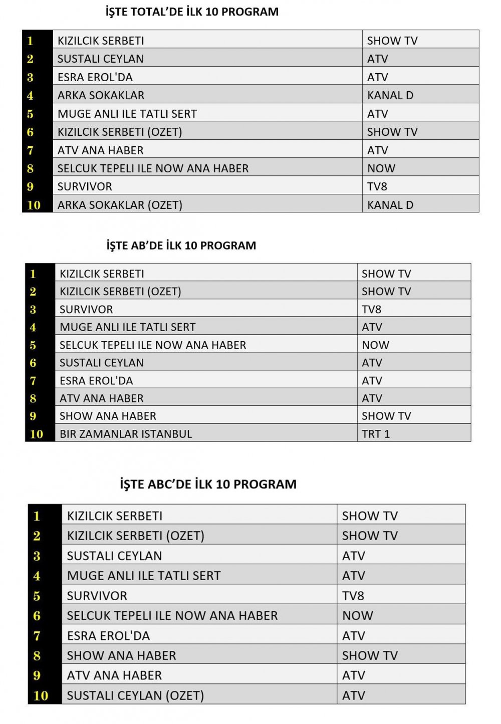 ABC1 grubunda da lider değişmedi; “Kızılcık Şerbeti” hem yeni bölümü hem de özetiyle ilk iki sırayı aldı. “Sustalı Ceylan” ise güçlü bir çıkışla üçüncü sırada yer aldı.